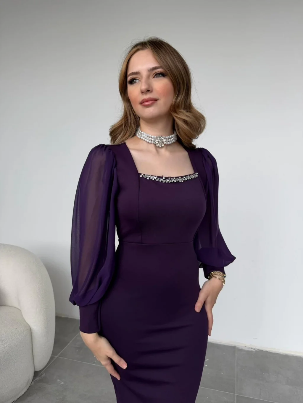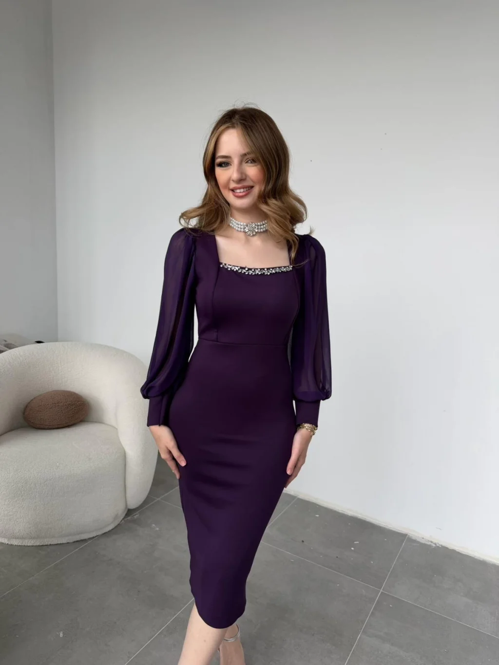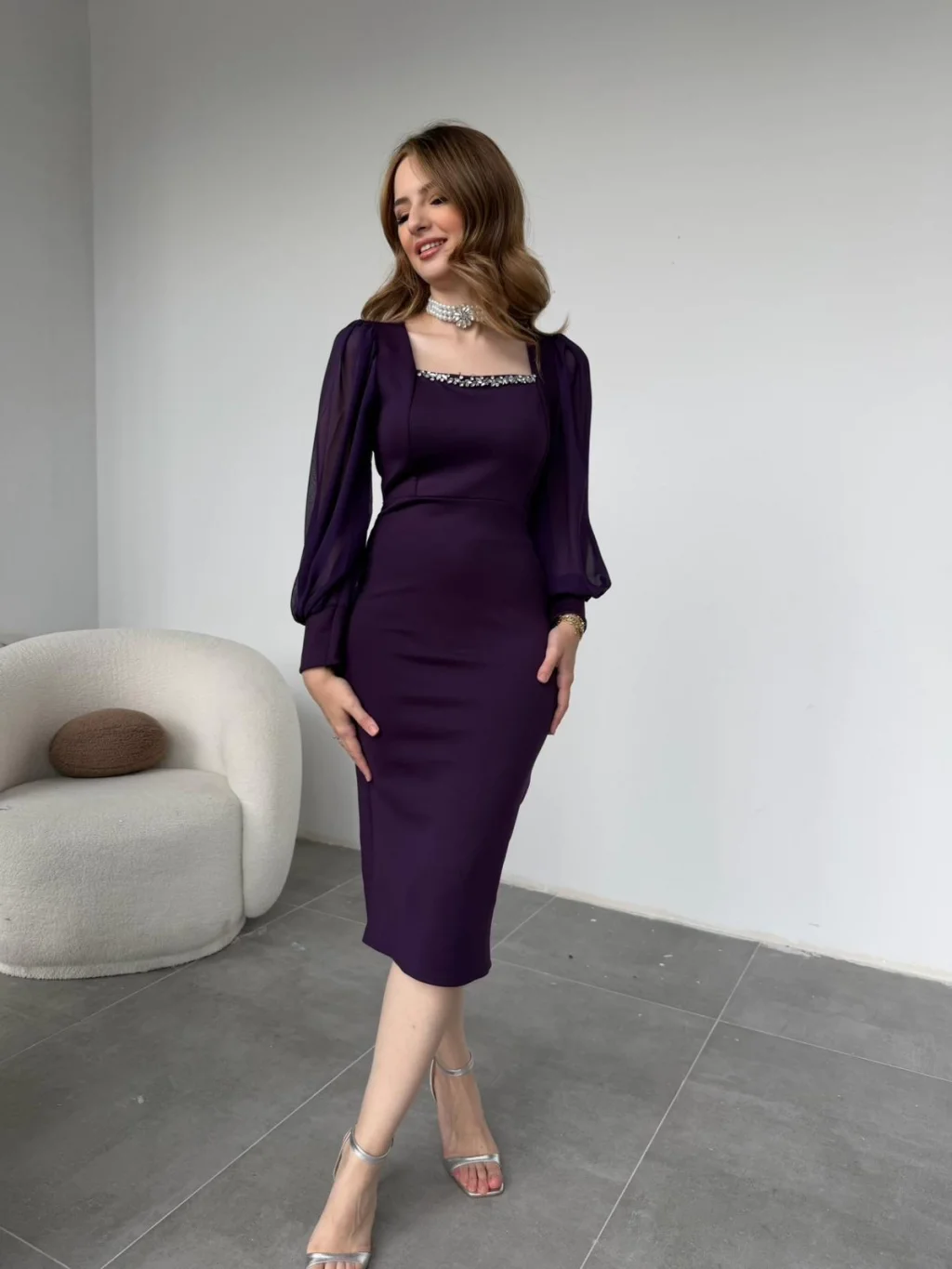 Taş işlemeli kare yaka detayıyla dikkat çeken bu elbise, vücudu mükemmel şekilde saran scuba kumaşıyla asil bir duruş sunuyor. Şifon tül kolları ve midi boy kesimiyle, özel davetlerden akşam yemeklerine kadar her ortamda sizi şık bir görünüme kavuşturur. Şıklığı zarafetle birleştiren bu model, sade takılarla tamamlandığında zamansız bir stil yaratır.