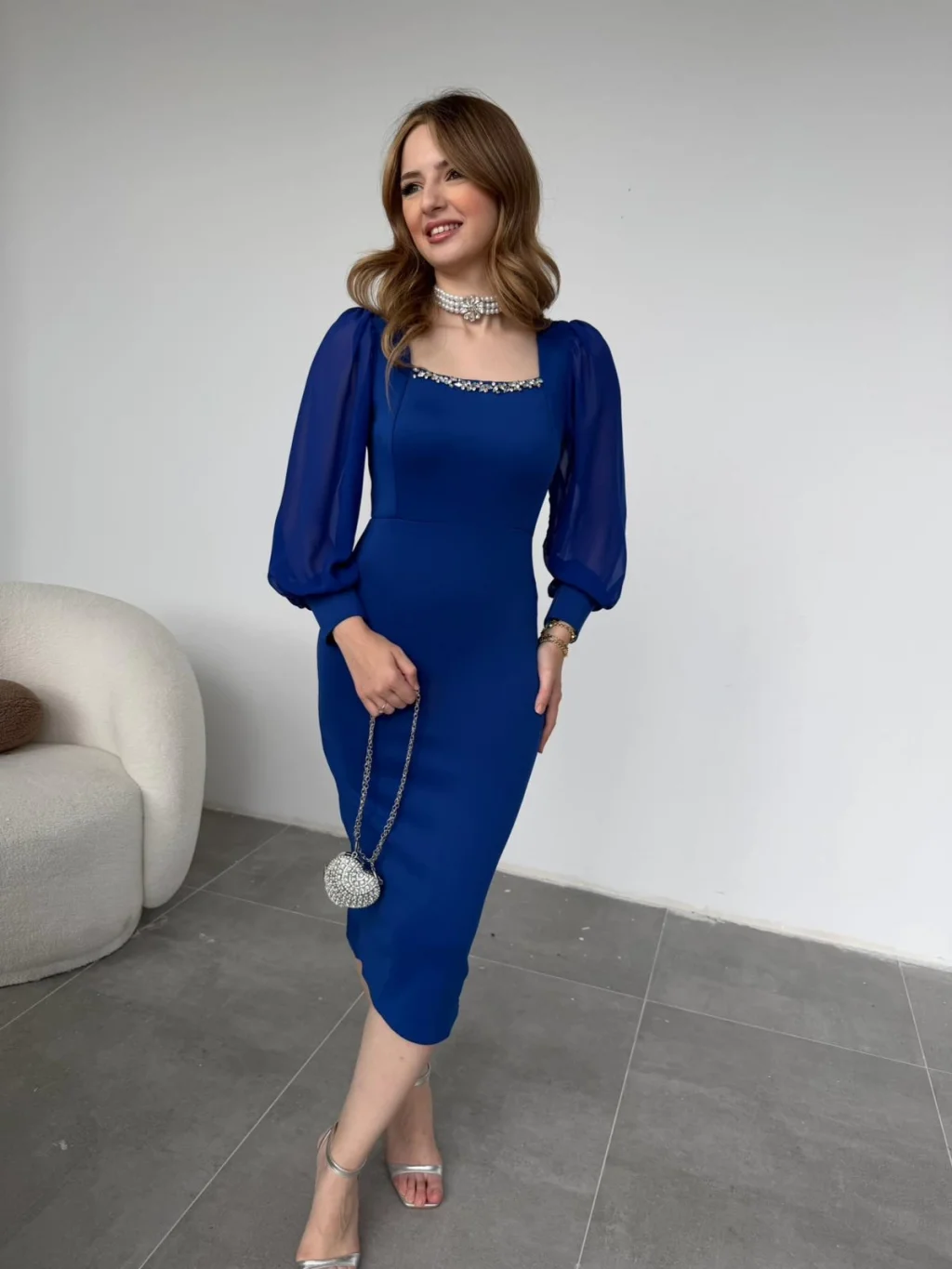 Taş Detaylı Kare Yaka Tül Kollu Midi Boy Saks Elbise