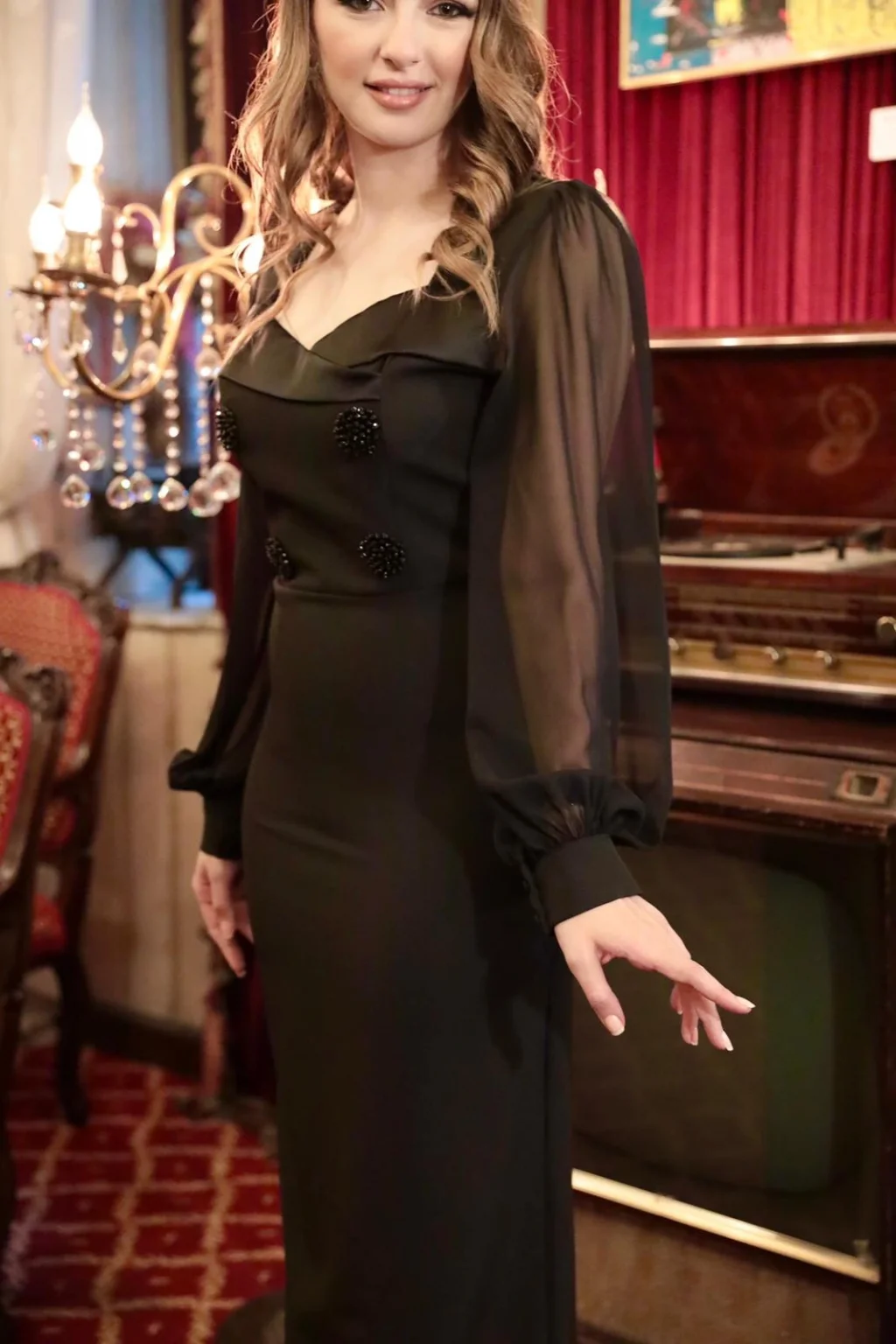 Taş Düğmeli Saten Yaka Detaylı Şifon Kol Siyah Elbise