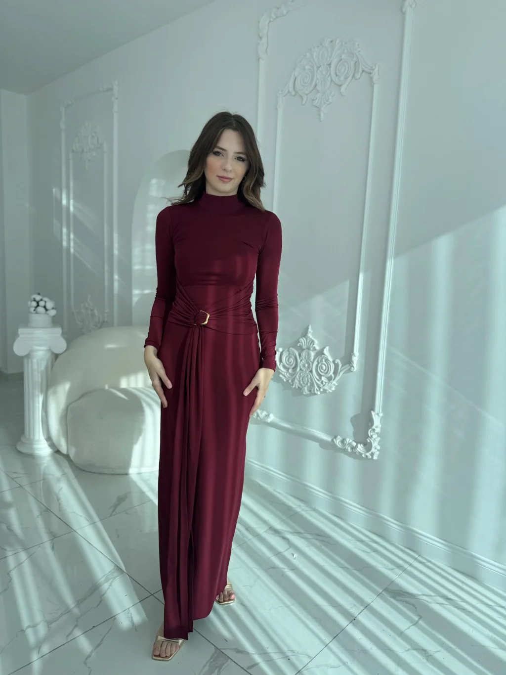 Tokalı Bel Detaylı Uzun Bordo Elbise