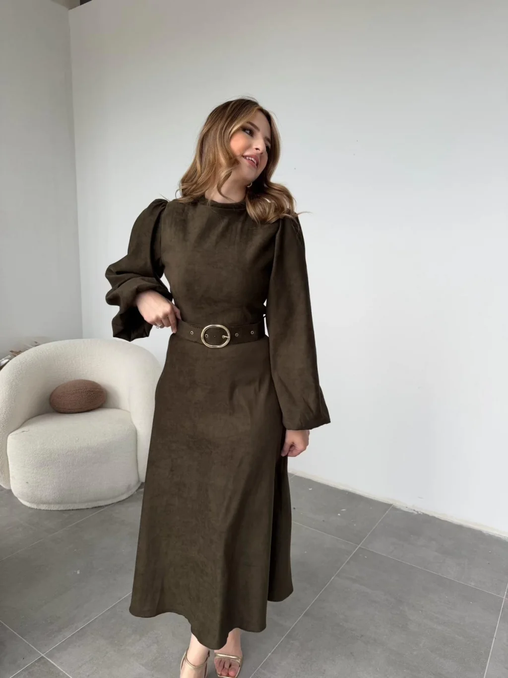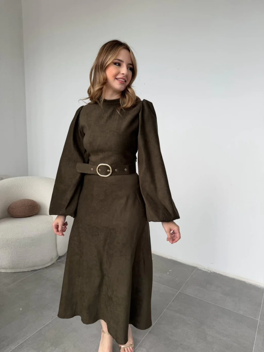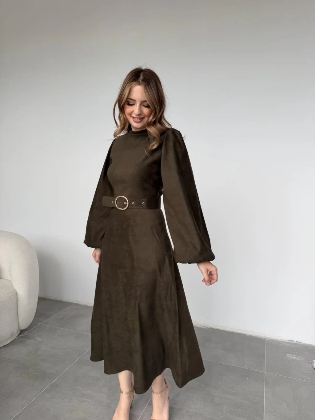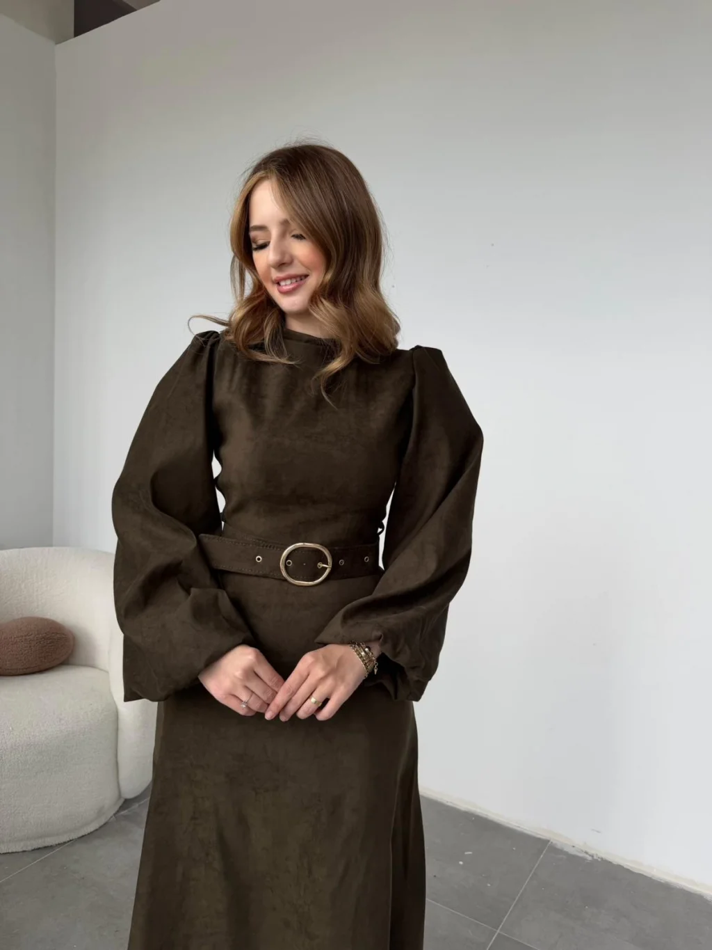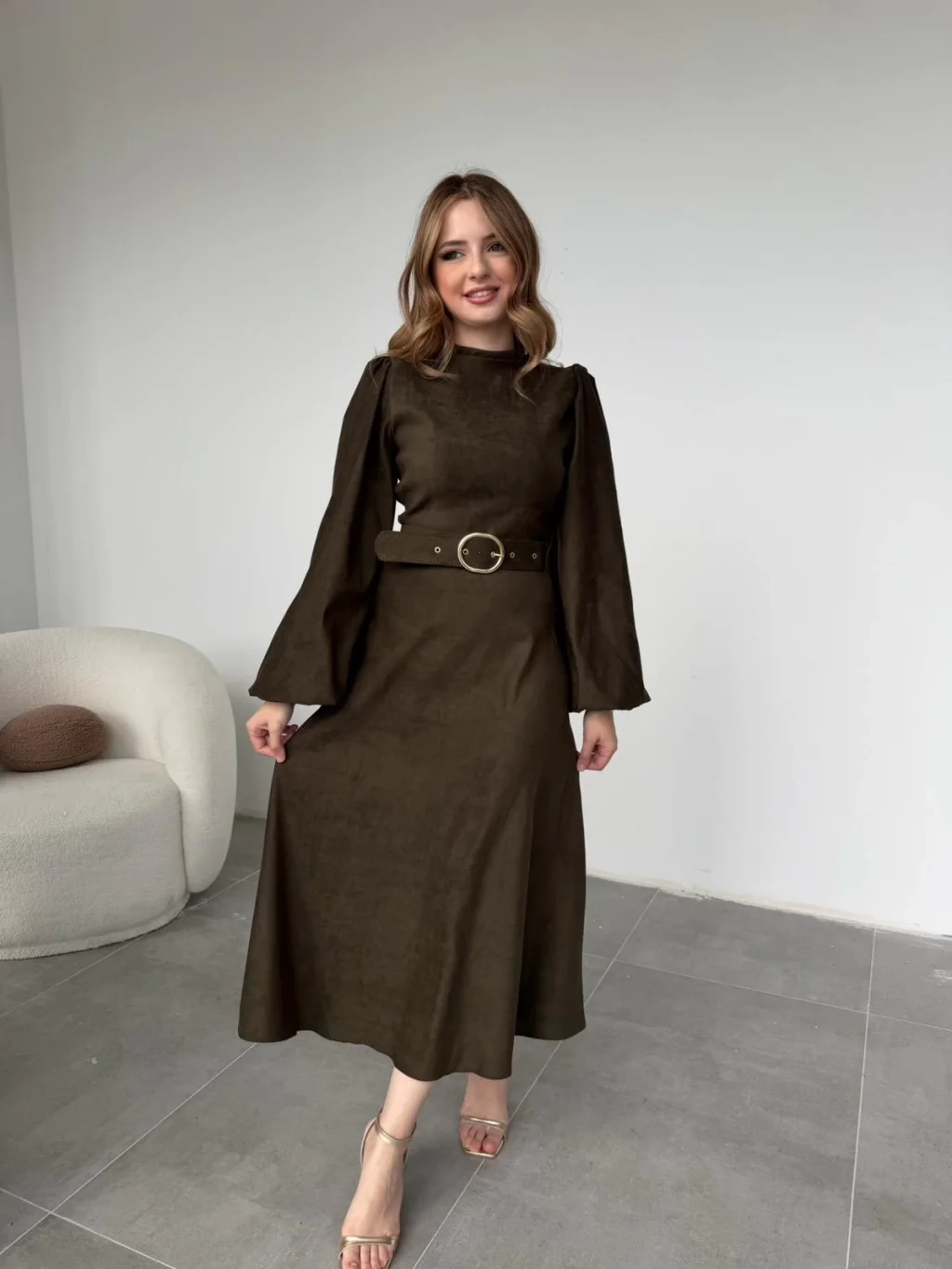 Yeni sezonda zarafeti ve şıklığı bir araya getiren bu süet kumaş elbise, sade ama etkileyici tasarımıyla öne çıkıyor. Tok yapılı dokusu sayesinde formunu koruyan model, bel kısmındaki büyük tokalı kemer detayı ile vücudu zarifçe vurguluyor. Uzun balon kolları ve yüksek yaka formuyla modern, asil ve zamansız bir görünüm sunar. Günlük kombinlerden özel davetlere kadar her ortamda rahatlıkla tercih edilebilir.