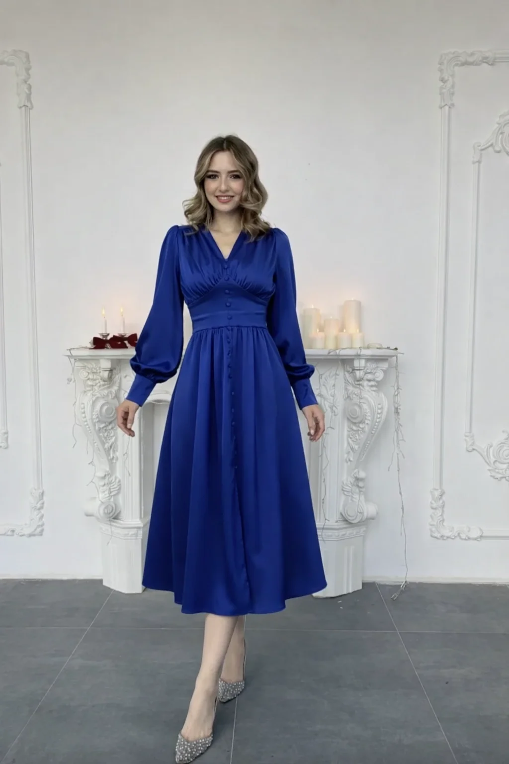Bu elbiseyi şık bir stiletto ve minimal takılarla kombinleyerek düğün, nişan veya romantik bir akşam yemeğinde kullanabilirsiniz. Tam kalıp yapısı sayesinde kendi bedeninizi güvenle tercih edebilirsiniz.