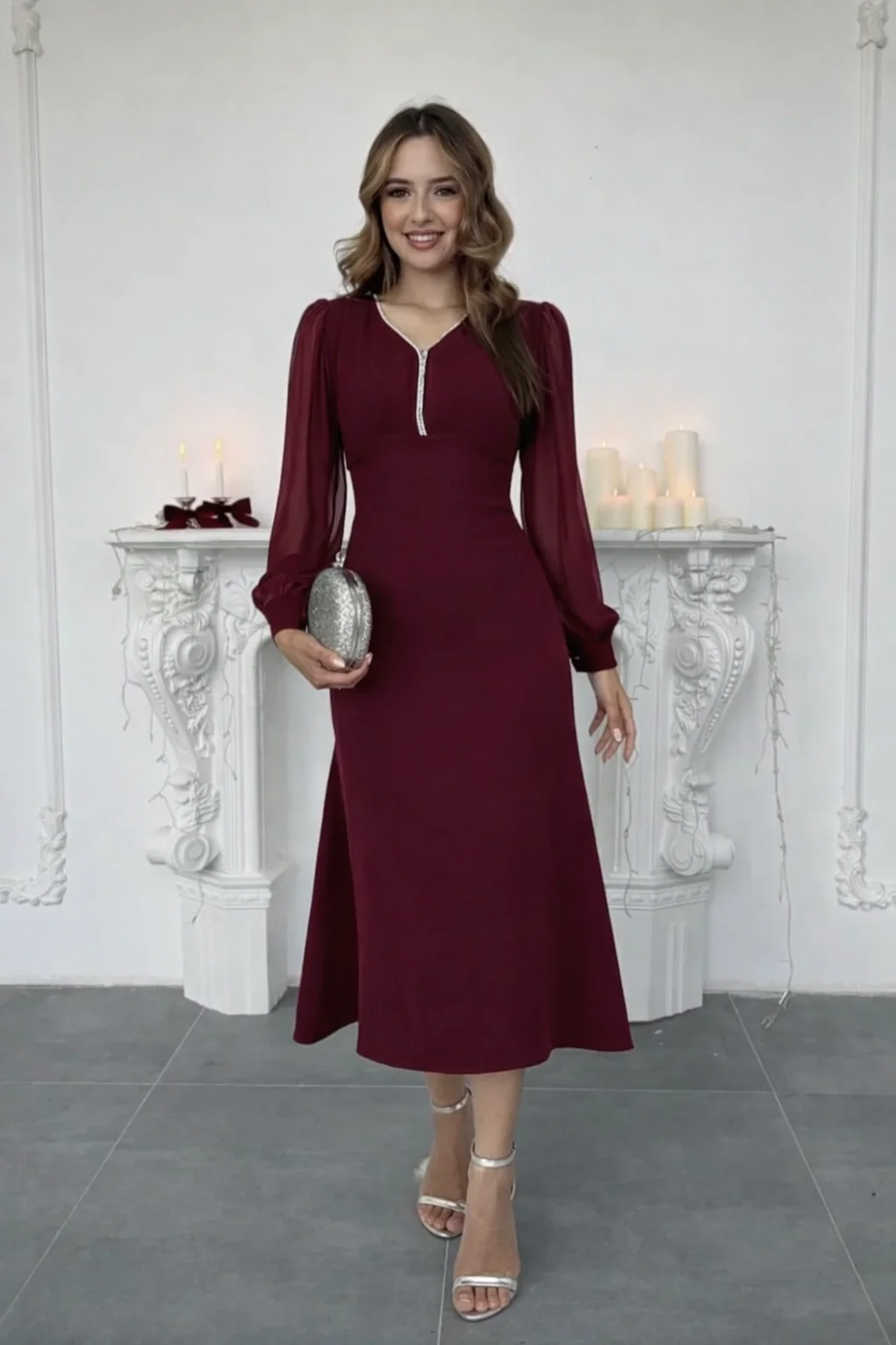 Özel günlerinize asalet katacak, her adımda zarafetinizi yansıtacak o efsane parça stoklarımızda! Bordo rengin en güzel tonuyla hazırlanan bu özel tasarım, atlas kumaşın vücudu kusursuz saran yapısı ile şifon kolların uçuş uçuş romantizmini bir araya getiriyor.
