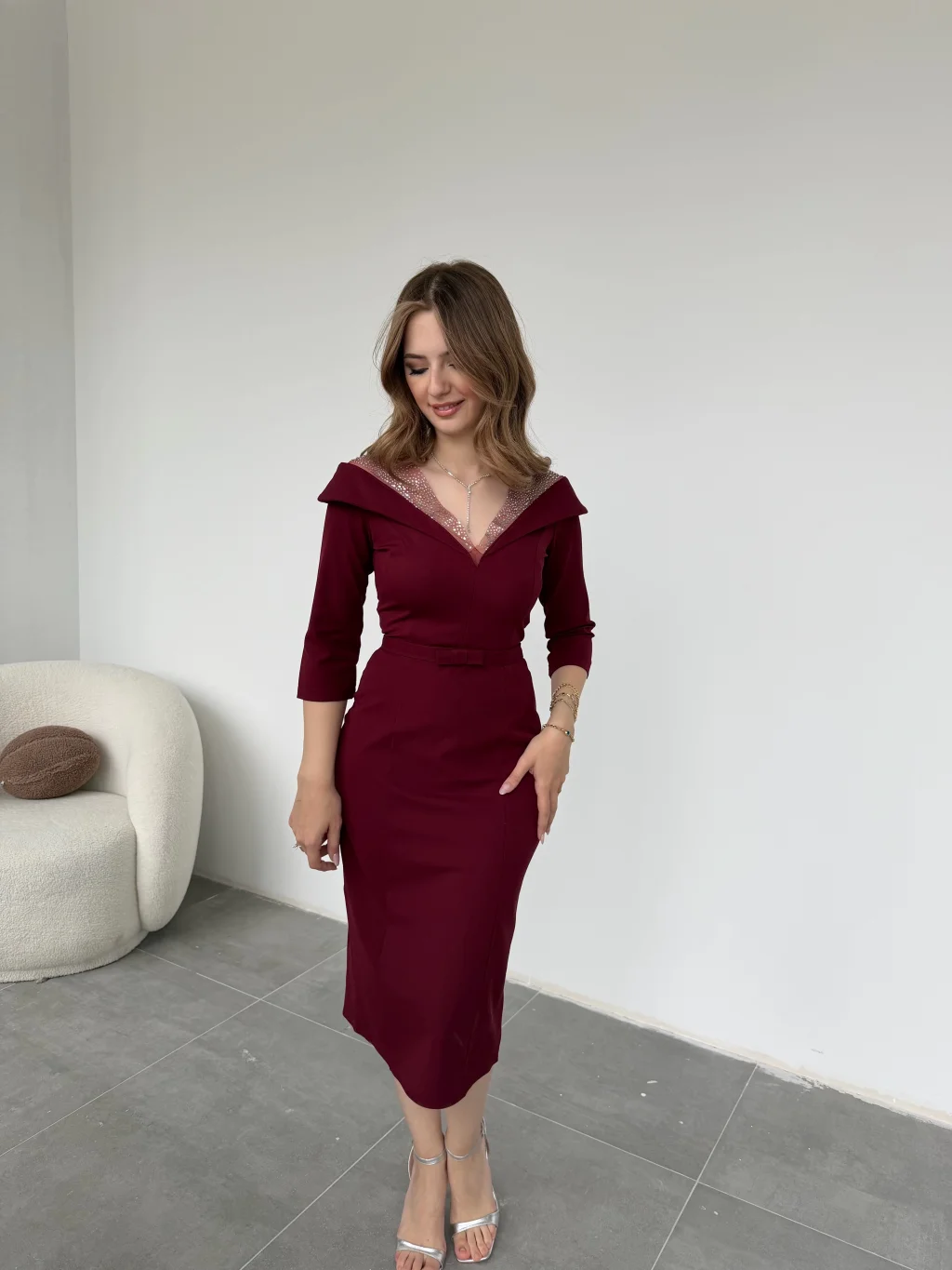 Yaka Tül Taş Detaylı Bordo Midi Boy Elbise