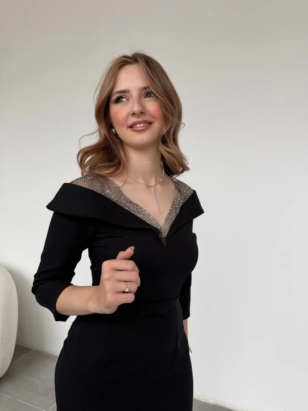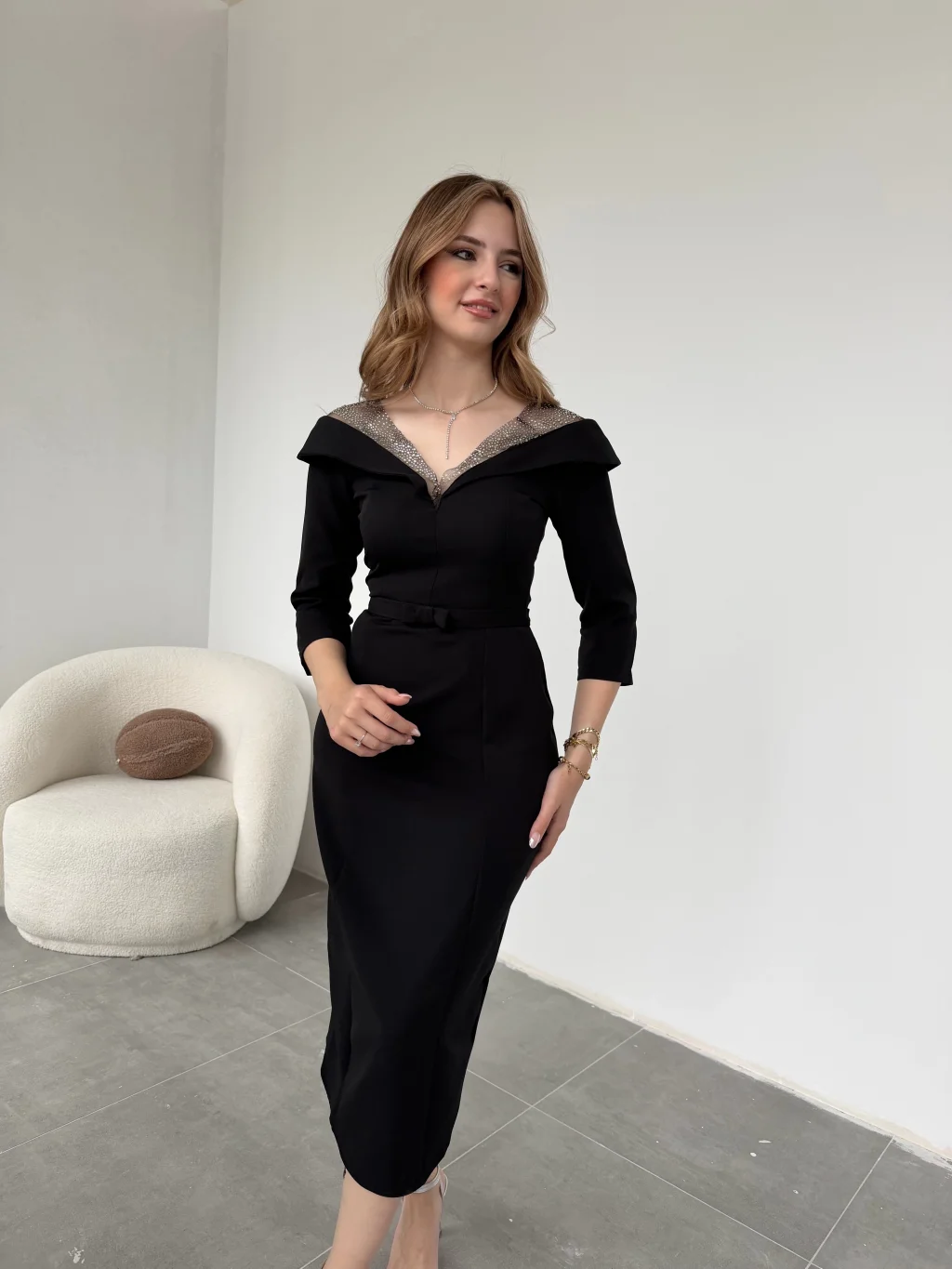 Yaka Tül Taş Detaylı Siyah Midi Boy Elbise