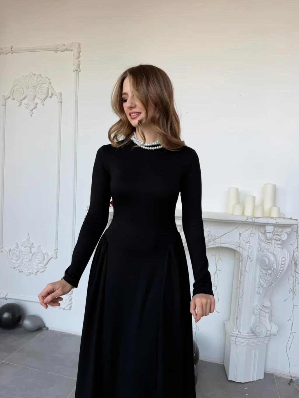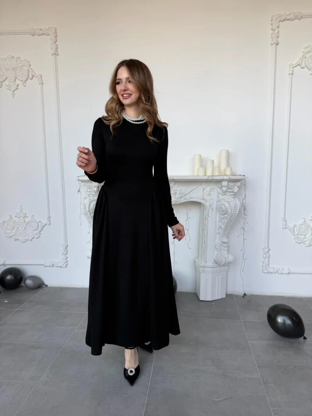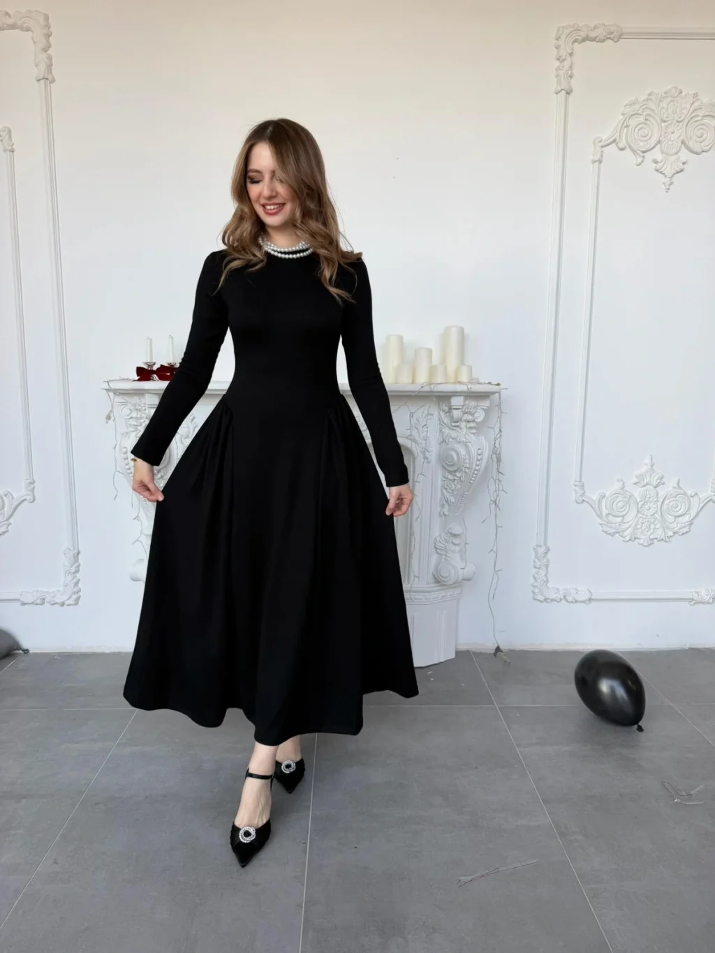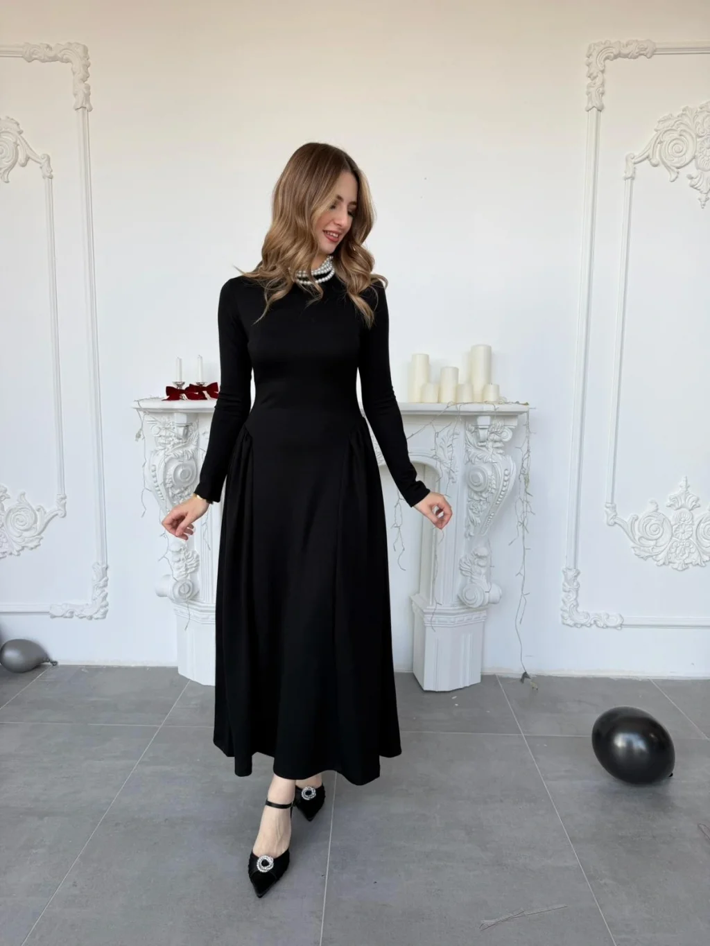 Yanları Büzgülü Bisiklet Yaka Uzun Kollu Scuba Siyah Elbise